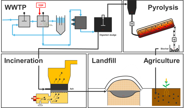 WWTPs are major hubs for ENMs released from consumer products during their use phase. To increase our understanding of how ENM move through and transform in WWTP, we spiked a pilot WWTP with selected ENMs over a period of several months. The transfer of the ENMs through the WWTP was assessed by comparing the mass of selected ENMs leaving the WWTP to the mass of the respective ENM accumulated in the sludge phase. Results indicate a high correlation between the removal efficiencies and the amount of sludge lost via the effluent. These findings point towards a very efficient attachment of ENM to sludge flocs during the wastewater treatment. Complementary results from single particle ICPMS measurements will further reveal, whether particles are discharged as individual nanoparticles or as (homo-/hetero-) agglomerates. Following these initial spiking experiments, ENM enriched sewage sludge was incinerated or pyrolyzed in pilot facilities. The resulting ashes and biochars are being investigated for the presence of (transformed) ENMs and will be used for additional batch leaching and column experiments to simulate the release of ENM from deposited sewage sludge ashes.